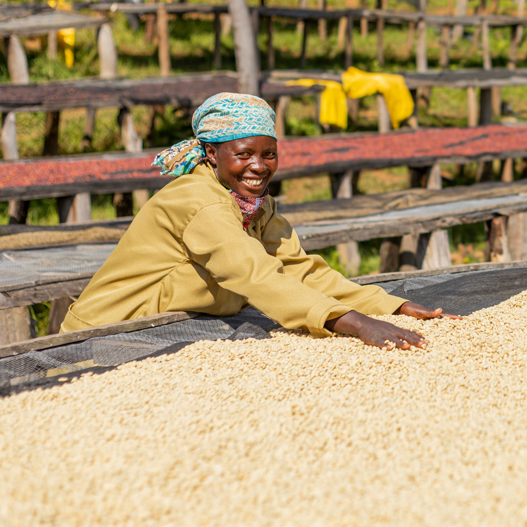 Beans are graded by density in the grading channel with very clean water that separates them into three different qualities: Grade A, Grade B, Grade C. Coffee is then hand-sorted at the pre-drying tables and then dried on raised beds with a mesh bottom, allowing for more circulation of air. The coffee is air and sun-dried between 9 am and 3 pm depending on the sun's intensity. The drying process takes 14 to 20 days depending on the weather. When dried, the coffee is well kept until it is hulled and sorted by experienced women and then packed in Grainpro and Jute bags for export.