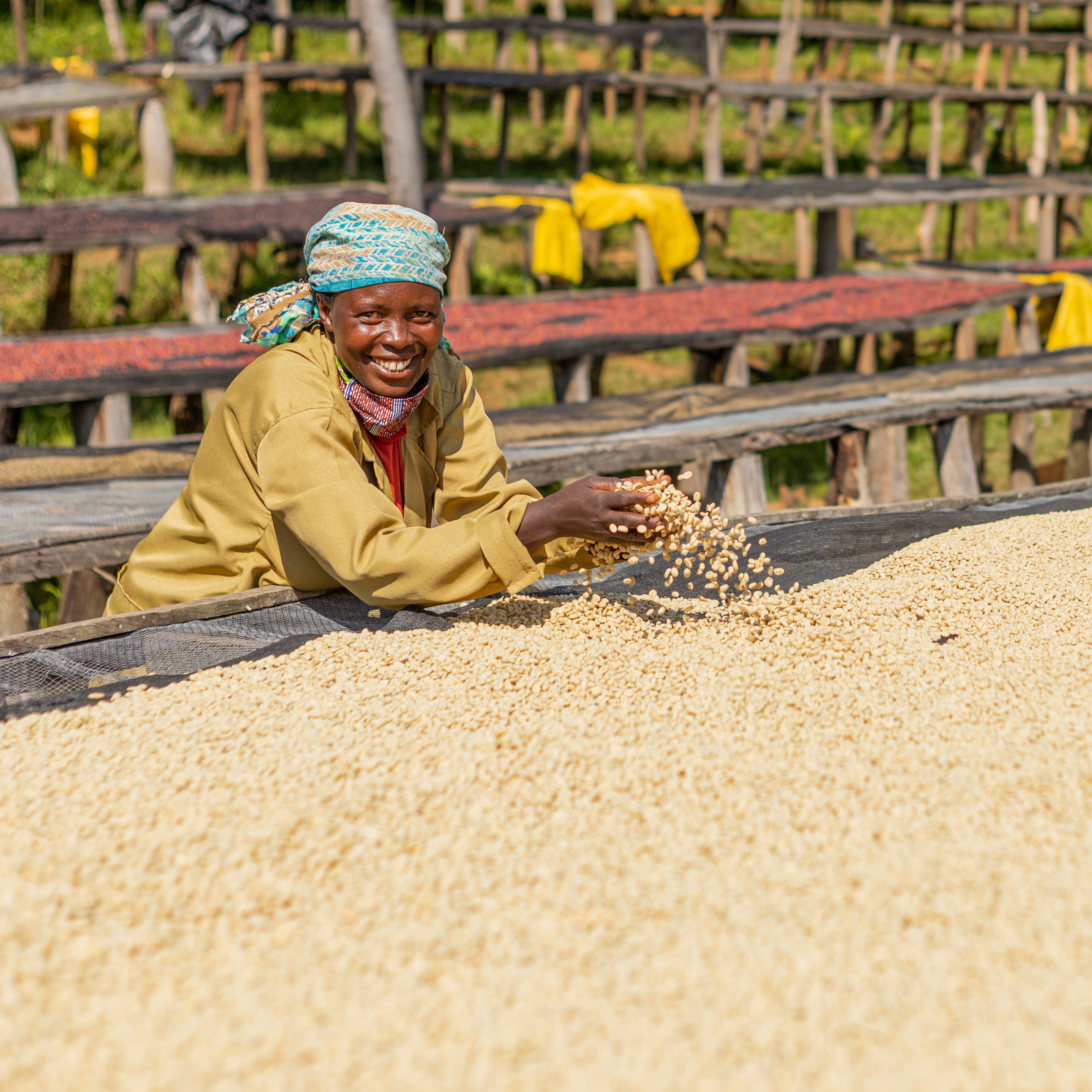 Beans are graded by density in the grading channel with very clean water that separates them into three different qualities: Grade A, Grade B, Grade C. Coffee is then hand-sorted at the pre-drying tables and then dried on raised beds with a mesh bottom, allowing for more circulation of air. The coffee is air and sun-dried between 9 am and 3 pm depending on the sun's intensity. The drying process takes 14 to 20 days depending on the weather. When dried, the coffee is well kept until it is hulled and sorted by experienced women and then packed in Grainpro and Jute bags for export.